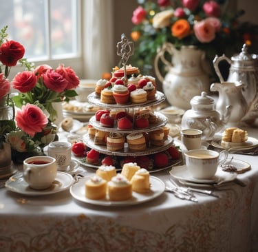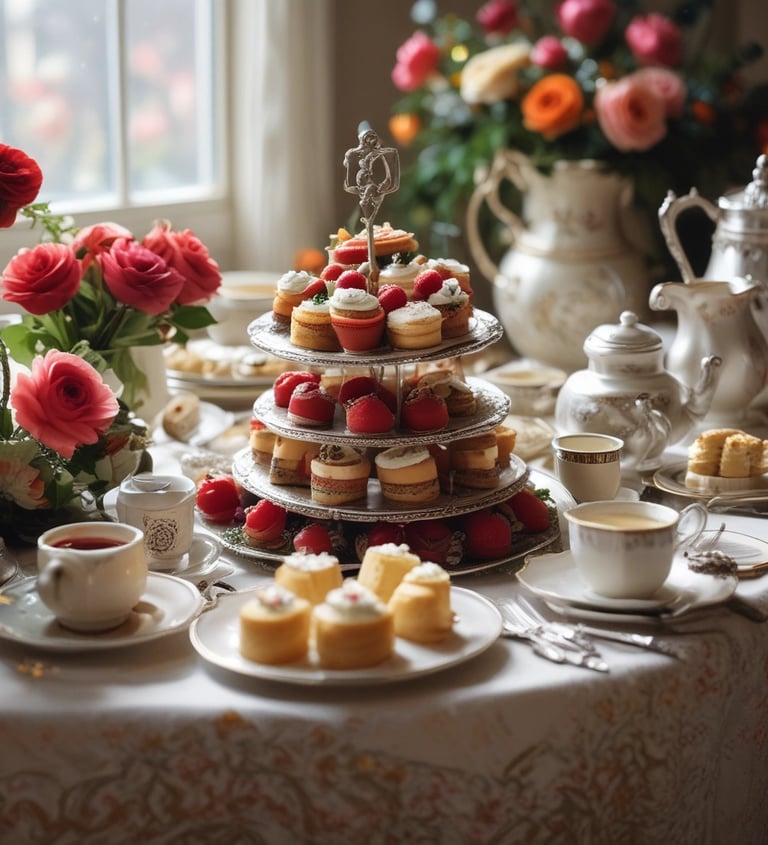 Centerpieces: Add fresh flowers like roses, peonies, or hydrangeas arranged in delicate vases or teapots. To elevate the look, include candlesticks, crystal accents, silver or gold tableware.